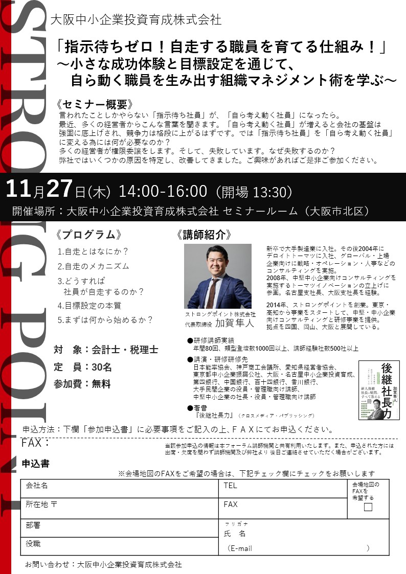 セミナー登壇のお知らせ 11月27日<大阪中小企業投資育成株式会社主催>「指示待ちゼロ!自走する職員を育てる仕組み!」
