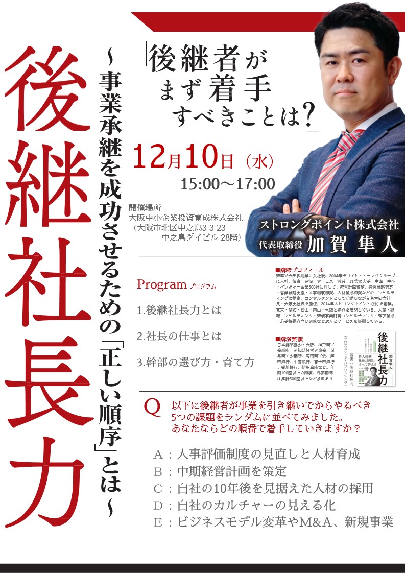 セミナー登壇のお知らせ 12月10日<大阪中小企業投資育成株式会社主催>後継社長力