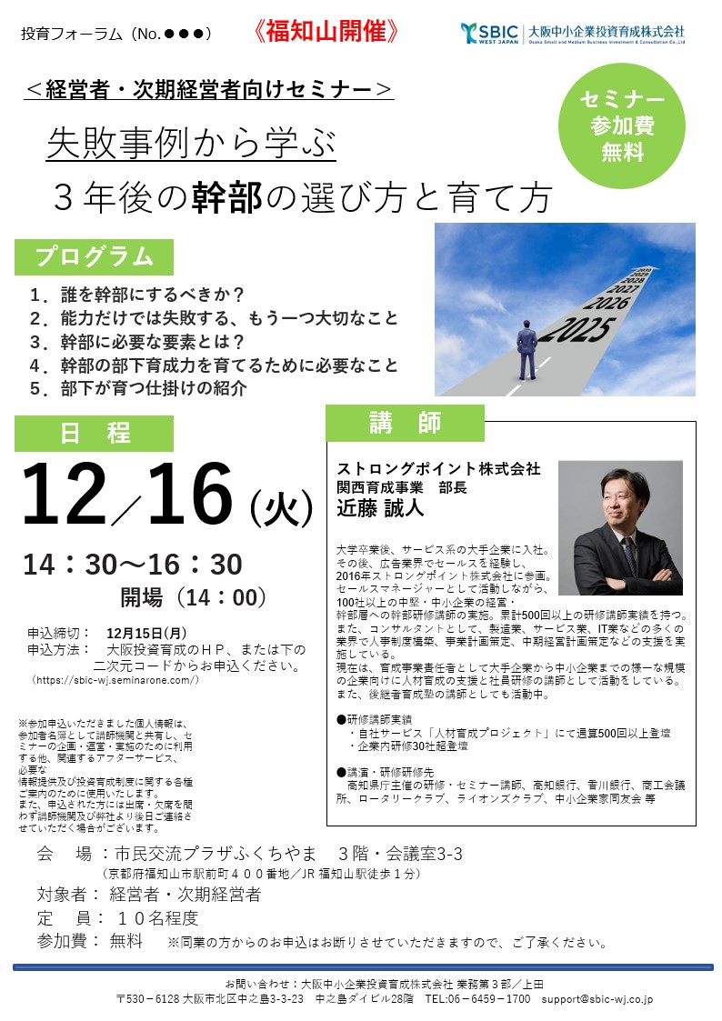 セミナー登壇のお知らせ 12月16日<大阪中小企業投資育成株式会社主催>失敗事例から学ぶ3年後の幹部の選び方と育て方