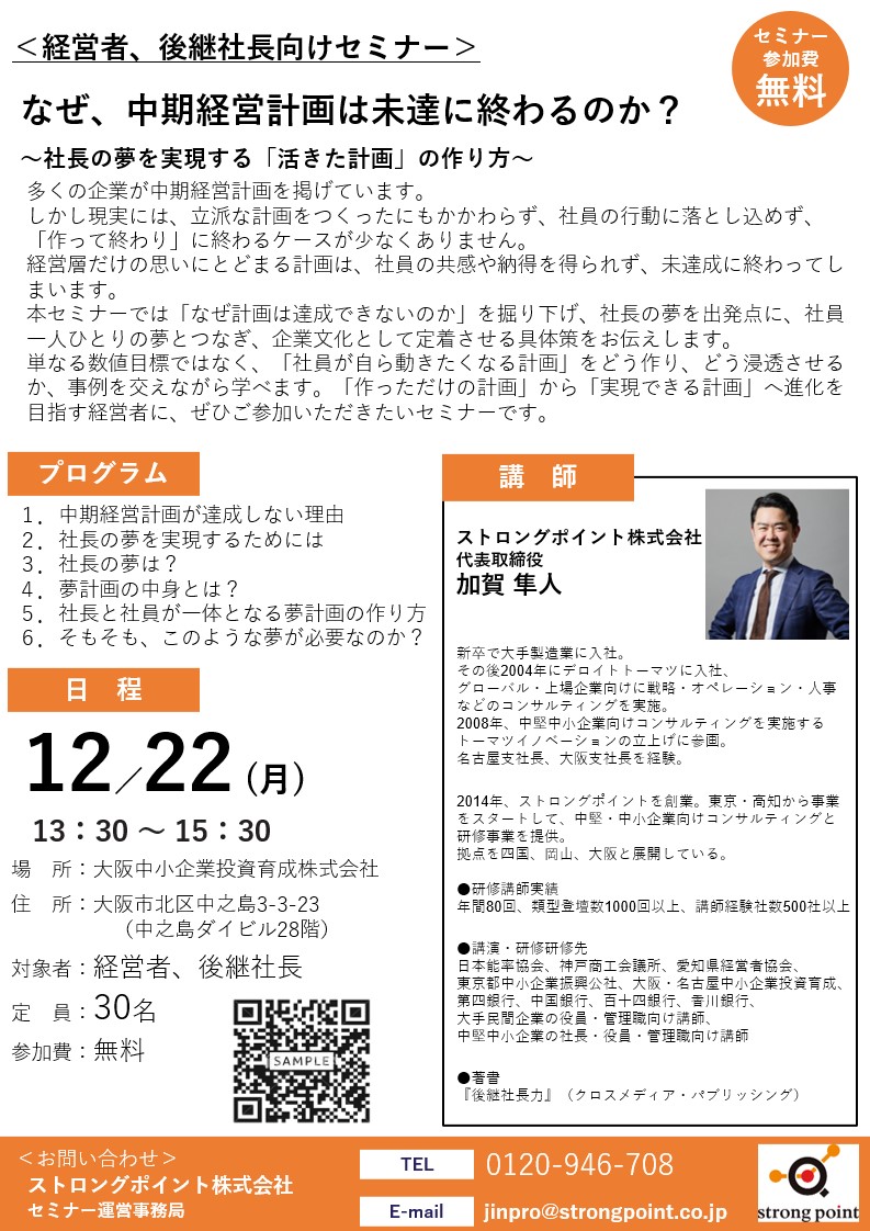 セミナー登壇のお知らせ 12月22日<大阪中小企業投資育成株式会社主催>なぜ、中期経営計画は未達に終わるのか?