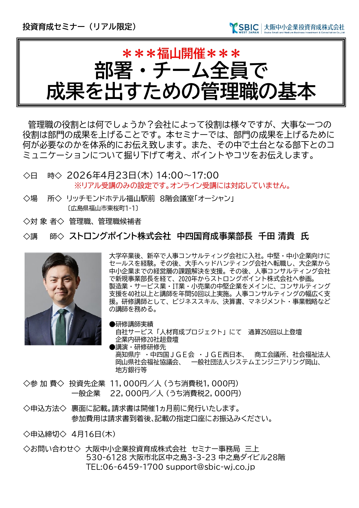 セミナー登壇のお知らせ 4月23日<主催:大阪中小企業投資育成株式会社>部署・チーム全員で成果を出すための管理職の基本